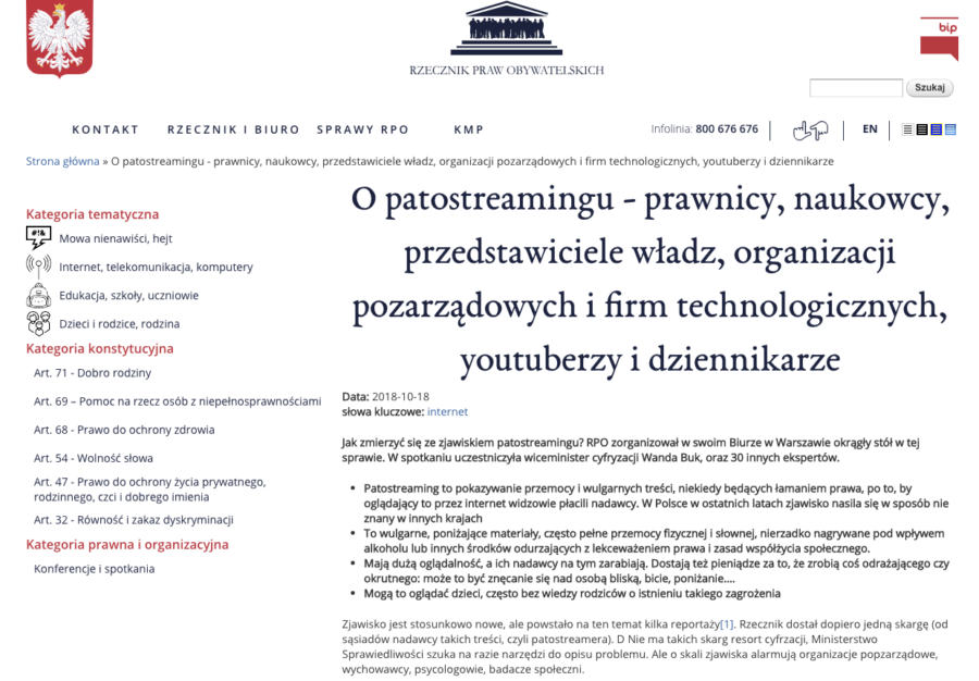 I właśnie patostreamerom i twórcom patologicznych treści było poświęcone spotkanie zorganizowane przez Rzecznika Praw Obywatelskich. Więcej informacji o formule i zaproszonych gościach znajdziecie w oficjalnym komunikacie na stronach RPO: O patostreamingu – prawnicy, naukowcy, przedstawiciele władz, organizacji pozarządowych i firm technologicznych, youtuberzy i dziennikarze.