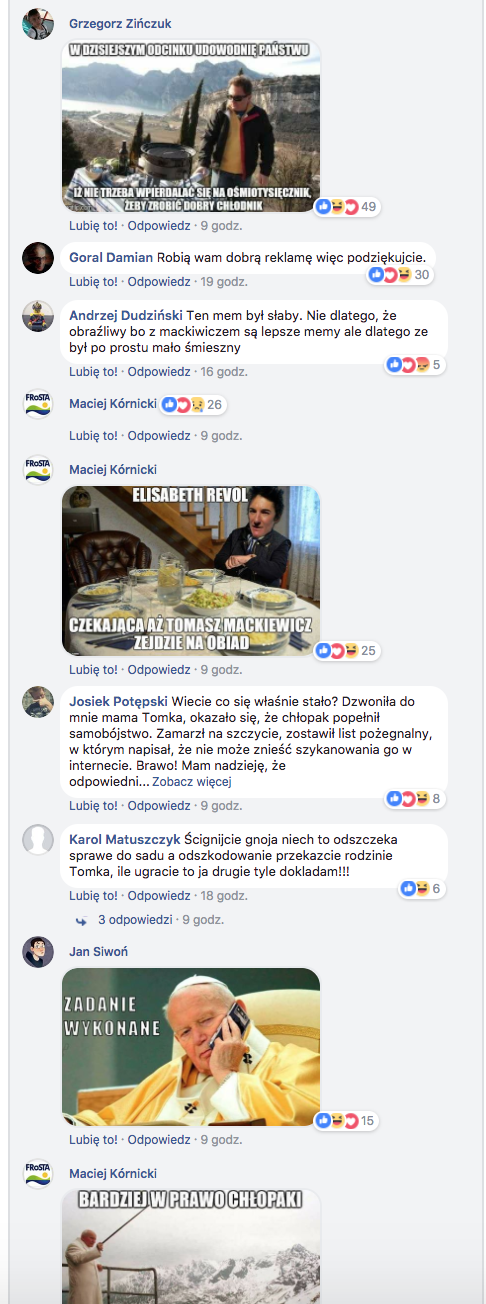 Jeden z byłych członków ekipy Pyta.pl umieścił na swoim Facebooku mema z wizerunkiem zmarłego Tomasza Mackiewicza, logiem Hortexu i podpisem „Himalajska Mrożonka”. Piszę ostrożnie, ponieważ w momencie pisania tekstu nie udało mi się potwierdzić u źródła kto jest dokładnie autorem tego mema.