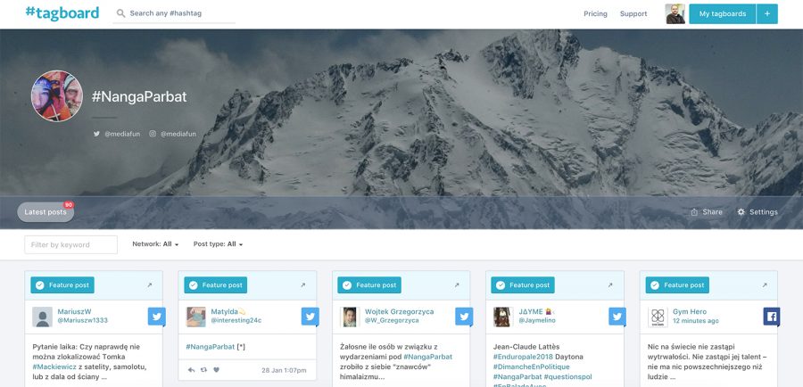 W poprzednim vlogu wspominałem o narzędziu #tagboard do śledzenia, monitorowania różnych wydarzeń. W przypadku akcji na #NangaParbat sprawdził się znakomicie, podając mi najnowsze doniesienie z Twittera, Facebooka i innych serwisów. W wersji darmowej nie można sięgnąć głębiej do archiwum, ale i tak jest dobrze – polecam sobie przeklikać: nangaparbat.online