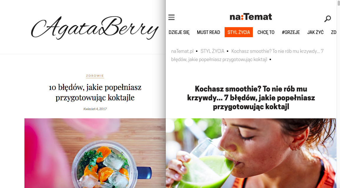 Dwa „różne” teksty, pierwszy na blogu 10 błędów, jakie popełniasz przygotowując koktajle i drugi w serwisie NaTemat Kochasz smoothie? To nie rób mu krzywdy… 7 błędów, jakie popełniasz przygotowując koktajl oraz obszerna analiza tekstów przez blogerkę – Jak duże portale wykorzystują artykuły blogerów? Przypadek natemat.pl
