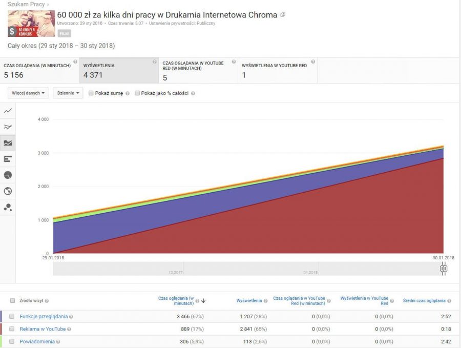 Kilka dni temu (21.01.2018) opublikowałem post zapowiadający film z Drukarni Chroma. Poinformowałem w nim o akcji, oraz oznaczyłem mojego operatora i naszego przewodnika. Z pewnym zaskoczeniem odkryłem, że post ten cieszy się bardzo dużym zainteresowaniem i w tej chwili po 10 dniach od publikacji zanotował blisko 7,5 tyś. wyświetleń. To co przykuło moją uwagę to zainteresowanie z firmy XYZ, o której wcześniej nie słyszałem, a z której pracownicy masowo oglądali tę informację. Być może „źle się dzieje” w tej firmie i pracownicy szukają większych pieniędzy?