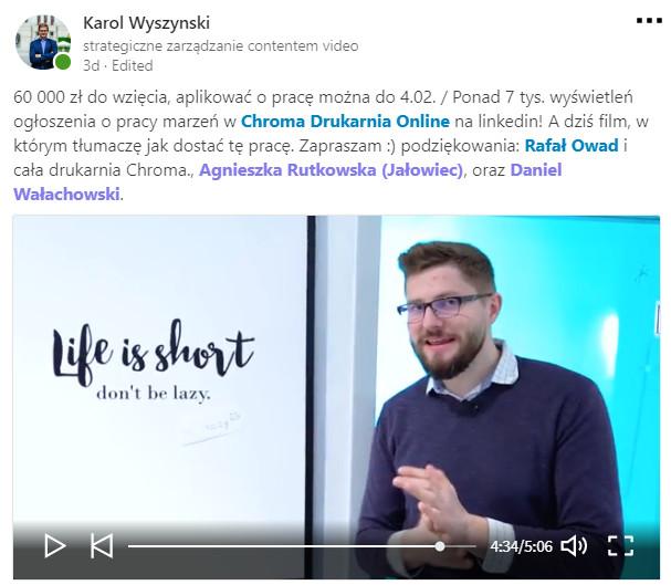 29.stycznia rozpocząłem krótki eksperyment. Opublikowałem ten sam film na 3 różnych playerach: YouTube, Facebook, oraz na LinkedIn. Film trwa 5 minut i dotyczy akcji rekrutacyjno-marketingowej Drukarni Internetowej Chroma (więcej info: https://goo.gl/3XHG8R ). Po 48 godz. od publikacji wyniki oglądalności każdego z filmów prezentują się następująco: