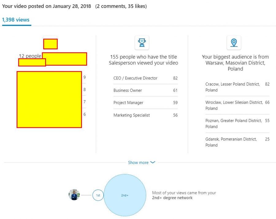 Co ciekawe większość widzów pochodzi z sieci 2. Stopnia „znajomi-znajomych”. Niestety statystyki LinkedIn są dość ograniczone. Wiem tylko, tyle że podana liczba wyświetleń dotyczy wyświetleń min. 3 sek. materiału. Co ciekawe, analityka LI daje mi informacje skąd pochodzili widzowie (firmy, stanowiska, oraz miejscowości). Szczególnie informacja o firmach, w których pracują widzowie, wydaje się być najciekawsza. Po namyśle zdecydowałem się ukryć nazwy firm. Dlaczego?