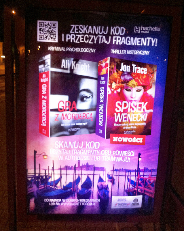 QR kod został niemierzony w Warszawie, oczywiście nie zauważyłem nikogo kto by go skanował (ale była późna pora). Umieszczony w bardzo dobrym miejscu – na przystanku autobusowym, gdzie jak wiadomo, czeka się na autobus i sprawdza statusy na fejsie. Jest w końcu motywator (a to wciąż rzadkość w polskich kreacjach) namawiający do zeskanowania kodu – zeskanuj kod, otrzymasz darmowy fragment książki – do autobusu jak znalazł. Ale po co ja to piszę, wszystko doskonale wyjaśnia plakat.
