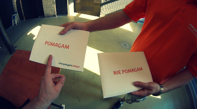 Nie mam pojęcia co jest w kopercie „Nie pomagam” – ja wybrałem tę pierwszą. Po rozpakowaniu koperty, niczym w bombie zegarowej, uruchamia się licznik i rozpoczyna się odliczanie. Adresat ma 72 godziny aby zdecydować się czy dołączyć do nowego, dużego projektu grupy Allegro – charytatywni.allegro.pl.
